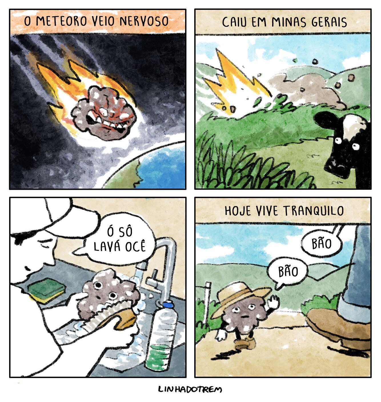 “Quando ‘não tenho inspiração’ falo sobre isso. E tenho muitas tiras sobre não ter ideias ou inspiração, e várias delas são melhores do que outras que eu fiz ‘inspirado’. Algo que percebi é que tenho a sorte de poder trabalhar quando estou com vontade e tesão pra criar. Se não estou no melhor momento, faço outra coisa e espero vir. Às vezes não vem o dia inteiro e atraso as tiras, porque sei que em outro momento faço duas ou três. Tem épocas que gosto de fazer de manhã, outras de noite, não tem regra. E gosto de fazer a tira e publicar na hora. Naquele momento, sinto que é a melhor coisa que tenho na cabeça. Se acúmulo tiras, o momento passa e eu olho e penso: ‘que diabos é isso?’. Aí eu tento mudar ou abandono a ideia.”